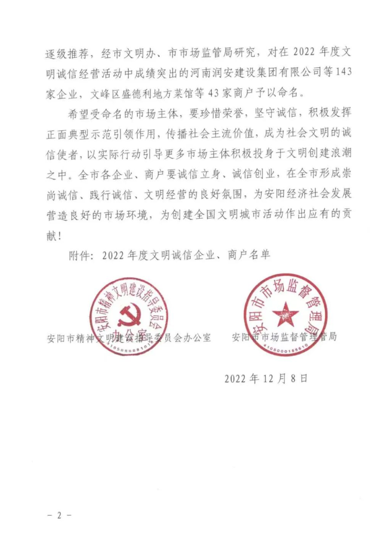 近日,安陽市精神文明建設指導委員會辦公室、安陽市市場監(jiān)督管理局聯(lián)合印發(fā)《關于命名2022年度安陽市“文明誠信企業(yè)、文明誠信商戶”的決定》。河南潤安建設集團有限公司、河南潤安建設集團房地產(chǎn)開發(fā)公司雙雙榮登“安陽市2022年度文明誠信企業(yè)”榜單,分別名列榜單第1名和第2名。
