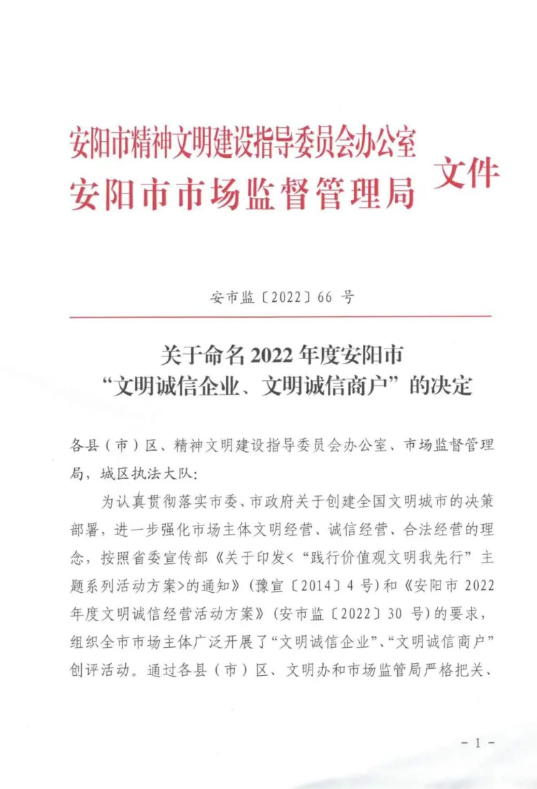 文件指出:為認真貫徹落實市委、市政府關于創(chuàng)建全國文明城市的決策部署,進一步強化市場主體文明經(jīng)營、誠信經(jīng)營、合法經(jīng)營的理念,組織全市市場主體廣泛開展了“文明誠信企業(yè)”、“文明誠信商戶”創(chuàng)評活動。通過各縣(市)、區(qū)文明辦和市場監(jiān)管局嚴格把關、逐級推薦,經(jīng)市文明辦、市市場監(jiān)管局研究,對在2022年度文明誠信經(jīng)營活動中成績突出的河南潤安建設集團有限公司等143家企業(yè)予以命名。具體文件如下: 潤安集團長期以來高度重視企業(yè)信用管理,堅持誠信經(jīng)營,傾力打造“潤安”品牌。此次獲評文明誠信企業(yè),充分說明了潤安集團在企業(yè)信譽、品牌建設方面得到了社會的高度認可,也必將成為公司高質(zhì)量發(fā)展的強大推動力。 下步,潤安集團將以此次表彰為契機,以習近平新時代中國特色社會主義思想和黨的二十大精神為指引,時刻保持依法經(jīng)營、誠信納稅的理念,積極發(fā)揮正面典型示范,樹立文明誠信的良好形象,堅持誠信立身、誠信創(chuàng)業(yè),為安陽經(jīng)濟社會發(fā)展營造良好的市場環(huán)境,為創(chuàng)建文明城市助力加油,作出貢獻。